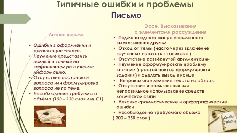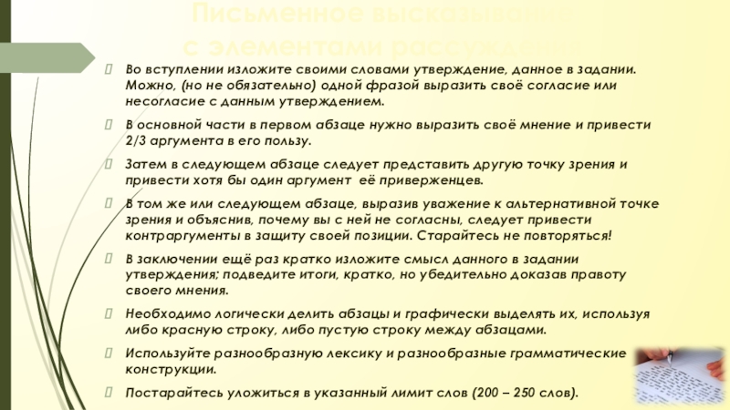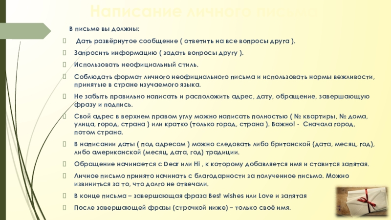 Необходимо уметь отбирать материал, нужный для более полного и точного выполнения задания в соответствии с поставленными коммуникативными задачами, а после написания проверять её как с точки зрения содержания, так и с точки зрения формы.