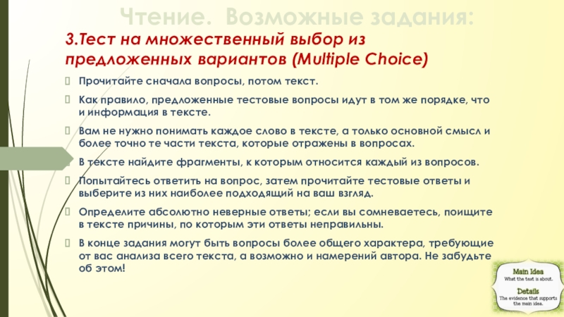 Не забывайте, что ответ 3 – Not stated нужно выбирать тогда, когда на основании текста нельзя дать ни положительного, ни отрицательного ответа.