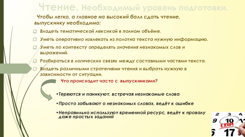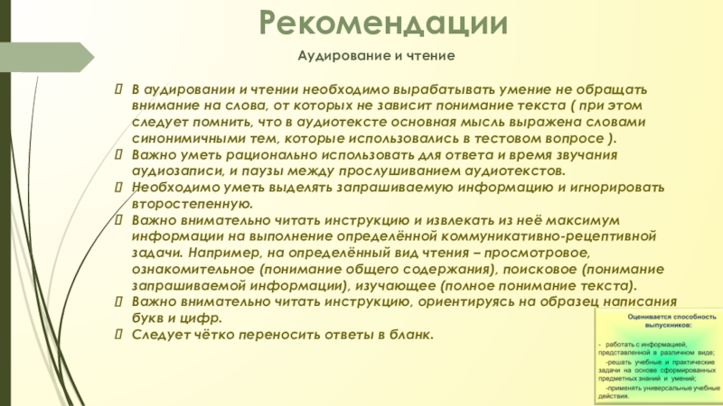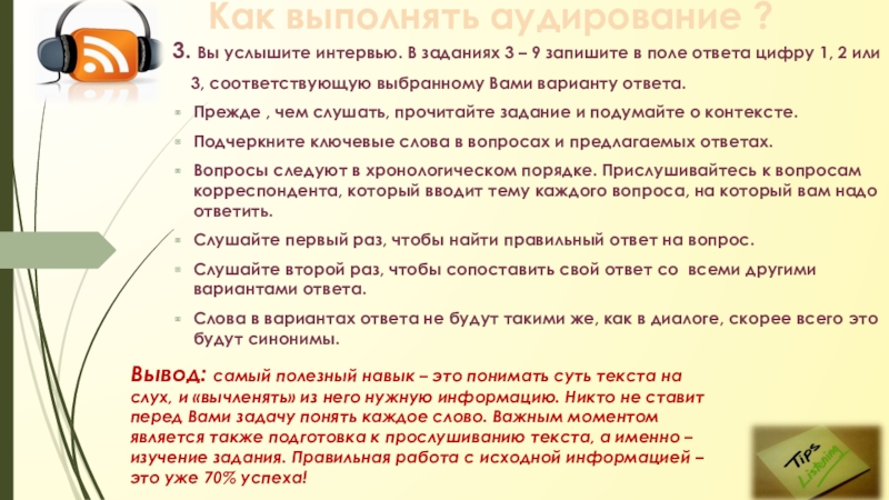 Вывод: самый полезный навык – это понимать суть текста на слух, и «вычленять» из него нужную информацию. Никто не ставит перед Вами задачу понять каждое слово. Важным моментом является также подготовка к прослушиванию текста, а именно – изучение задания. Правильная работа с исходной информацией – это уже 70% успеха!