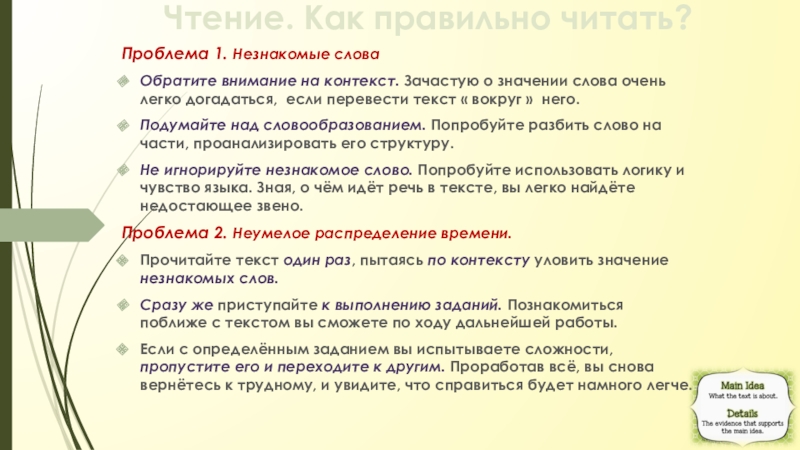 Для начала необходимо уловить суть текста, читайте, не обращая внимание на незнакомые слова.