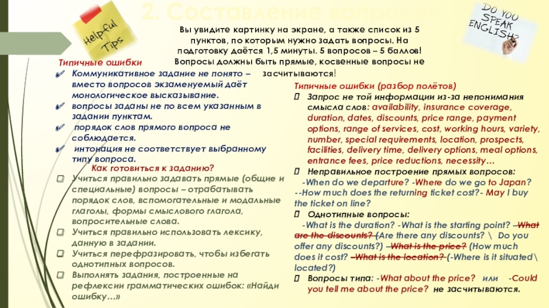 Учиться правильно задавать прямые (общие и специальные) вопросы – отрабатывать порядок слов, вспомогательные и модальные глаголы, формы смыслового глагола, вопросительные слова.