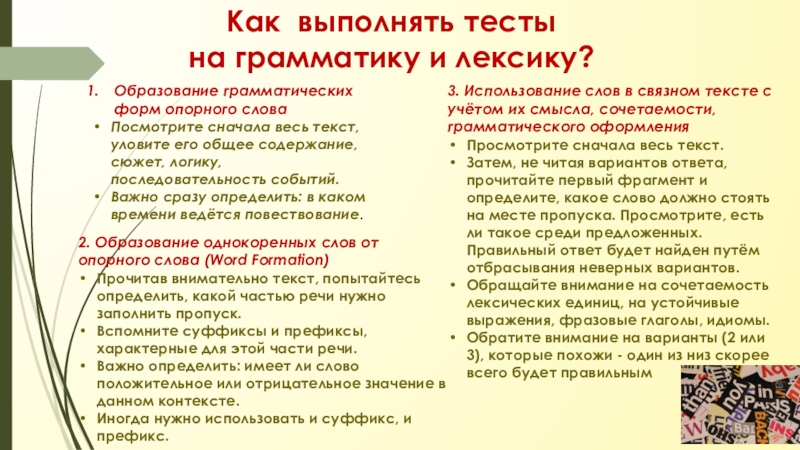 Обращайте внимание на сочетаемость лексических единиц, на устойчивые выражения, фразовые глаголы, идиомы.