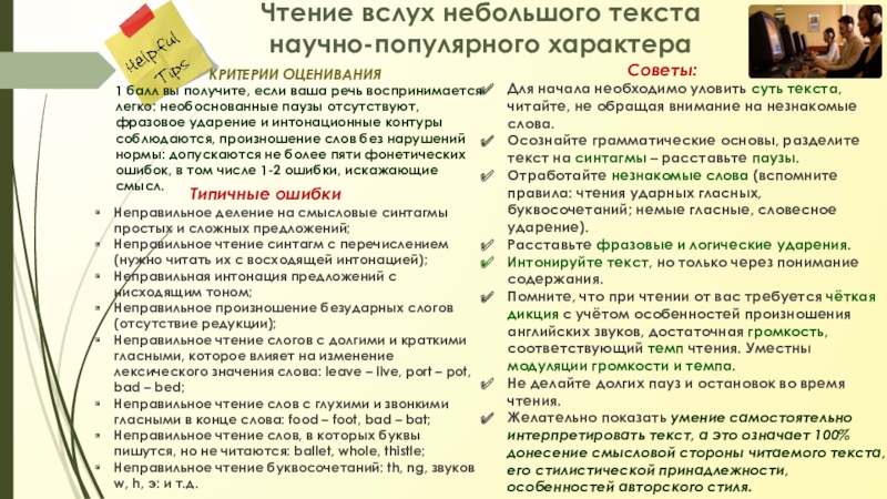 Помните, что при чтении от вас требуется чёткая дикция с учётом особенностей произношения английских звуков, достаточная громкость, соответствующий темп чтения. Уместны модуляции громкости и темпа.