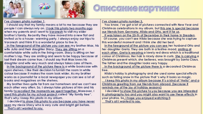 Начните ответ с этой фразы, предварительно выбрав номер фотографии: I’ve chosen the photo number 1. Затем продолжите описание, отвечая на каждый пункт плана 2 – 3 предложениями: