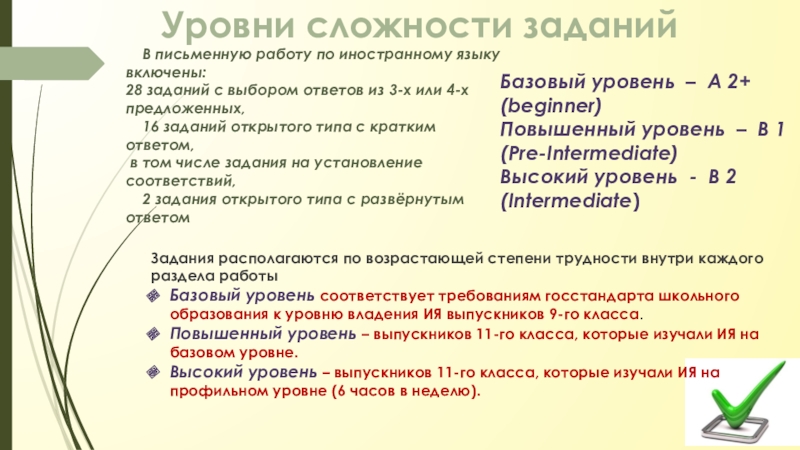 Повышенный уровень – выпускников 11-го класса, которые изучали ИЯ на базовом уровне.