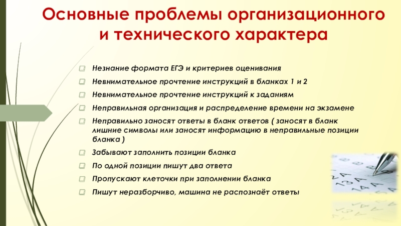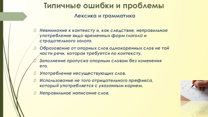 Невнимание к контексту и, как следствие, неправильное употребление видо-временных форм глагола и страдательного залога.