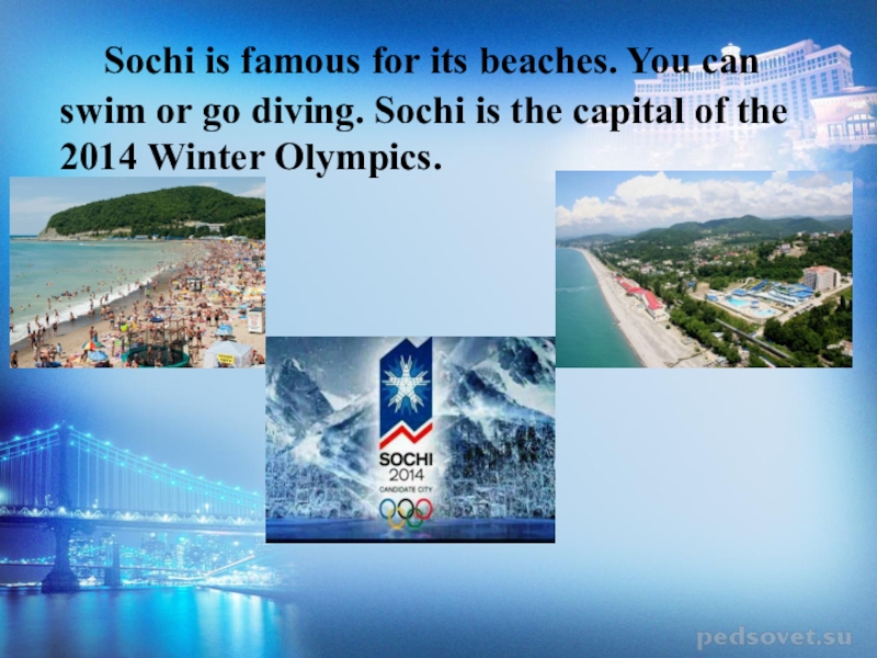 Sochi is famous for its beaches. You can swim or go diving. Sochi is the capital of