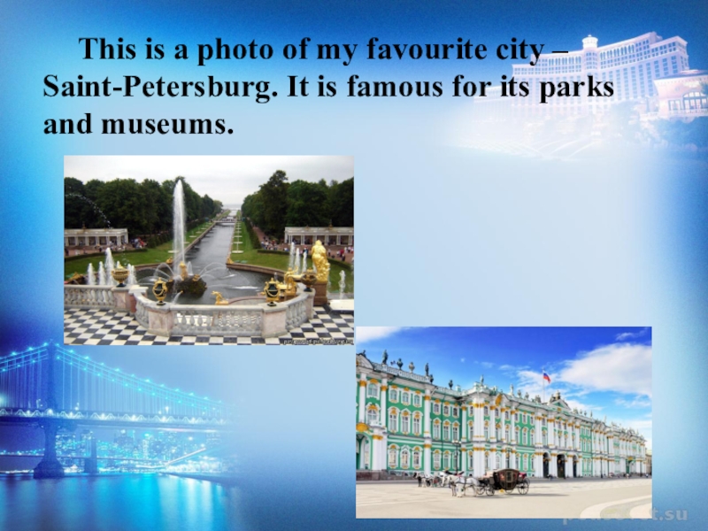 This is a photo of my favourite city – Saint-Petersburg. It is famous for its parks and