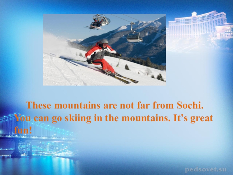 These mountains are not far from Sochi. You can go skiing in the mountains. It’s great fun!
