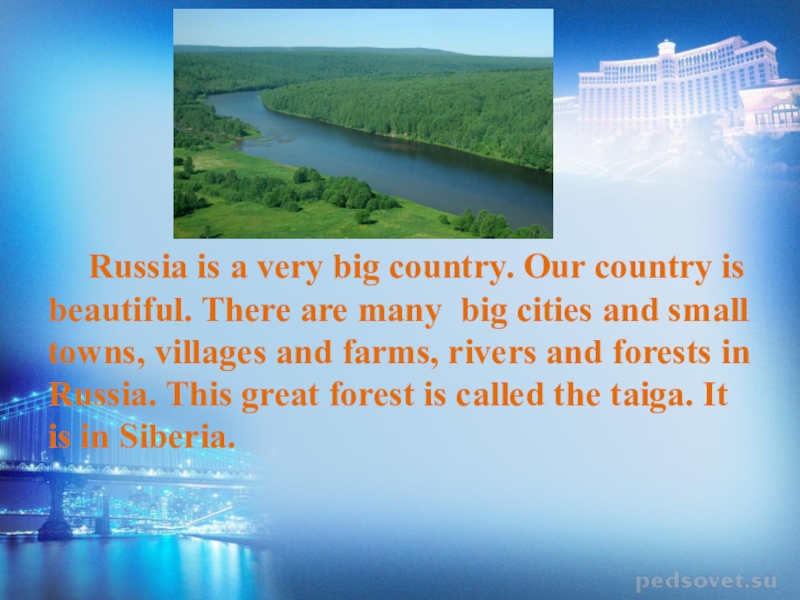 are many big cities and small towns, villages and farms, rivers and forests in Russia. This great forest is called the taiga. It is in Siberia.