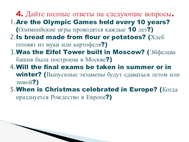 4. Дайте полные ответы на следующие вопросы.Are the Olympic Games held every 10 years? (Олимпийские игры проводятся