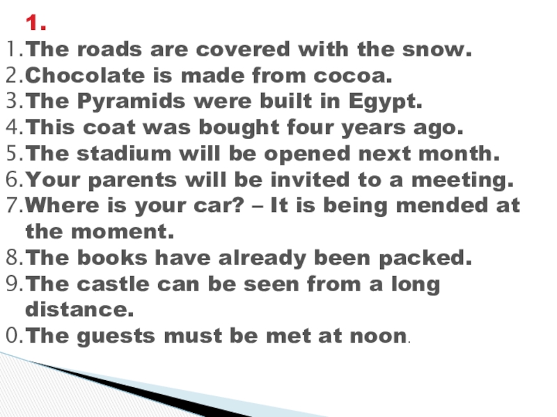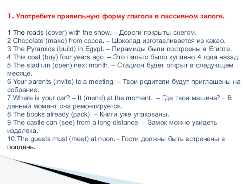 1. Употребите правильную форму глагола в пассивном залоге.1.The roads (cover) with the snow. – Дороги покрыты снегом.2.Chocolate (make) from cocoa. – Шоколад изготавливается из какао.3.The Pyramids (build) in Egypt. – Пирамиды были построены в Египте.4.This coat