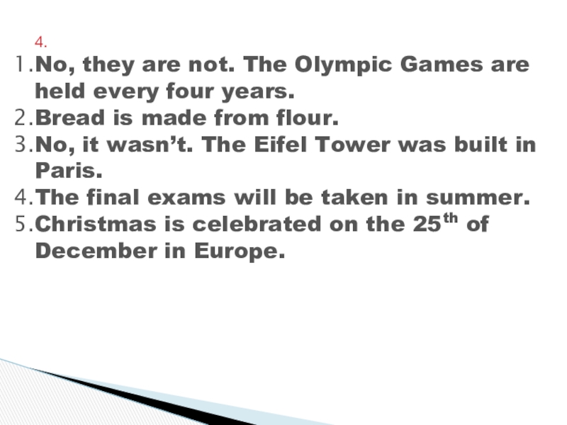 4.No, they are not. The Olympic Games are held every four years.Bread is made from flour.No, it