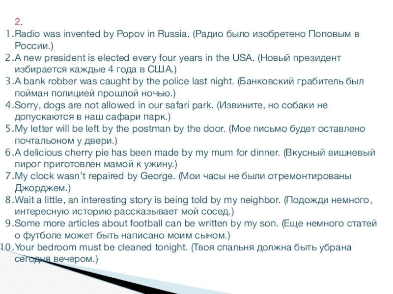2.Radio was invented by Popov in Russia. (Радио было изобретено Поповым в России.)A new president is elected every four years in