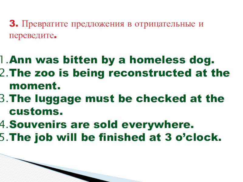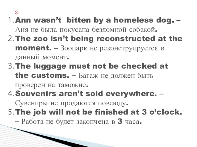 3. Превратите предложения в отрицательные и переведите.Ann was bitten by a homeless dog.The zoo is being reconstructed