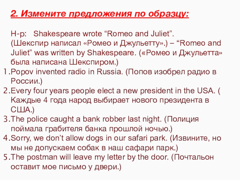 2. Измените предложения по образцу:Н-р:   Shakespeare wrote “Romeo and Juliet”. (Шекспир написал «Ромео и Джульетту».) – “Romeo and Juliet” was written by Shakespeare.