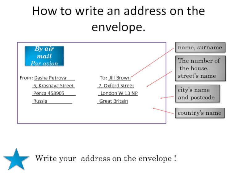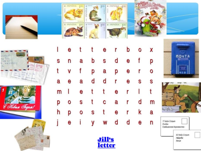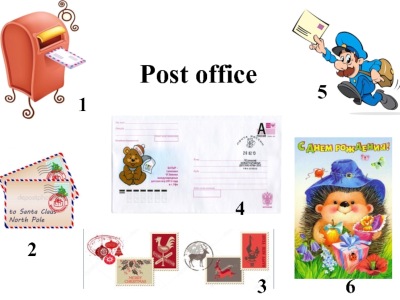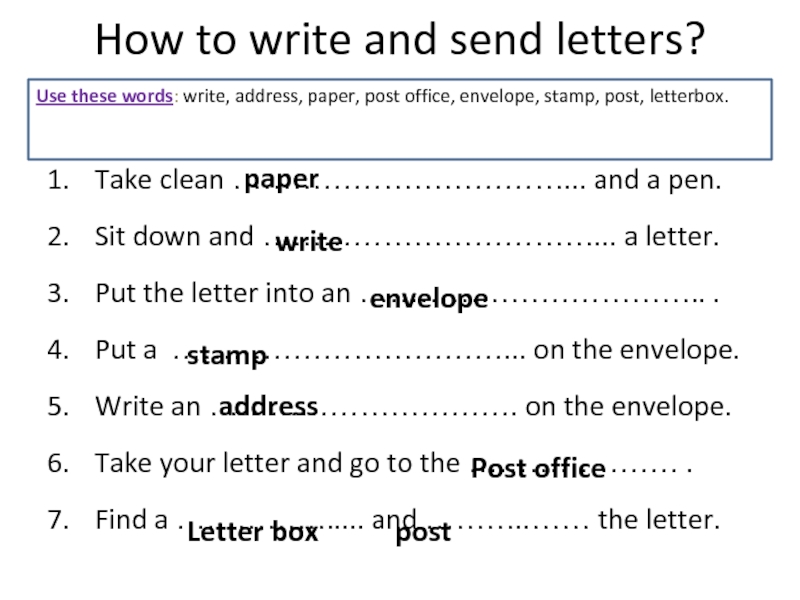 Use these words: write, address, paper, post office, envelope, stamp, post, letterbox.