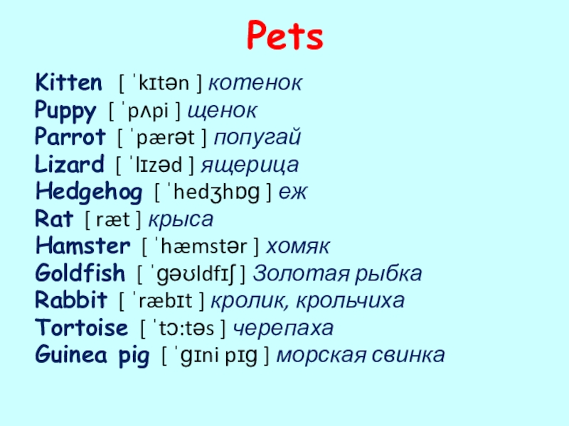 Pets Kitten  [ ˈkɪtən ] котенокPuppy [ ˈpʌpi ] щенокParrot [ ˈpærət ] попугайLizard [ ˈlɪzəd ]