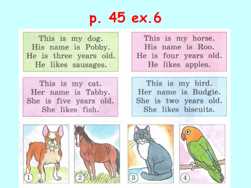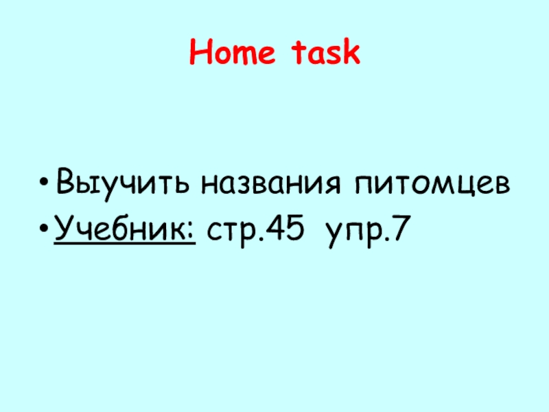 Home taskВыучить названия питомцевУчебник: стр.45 упр.7