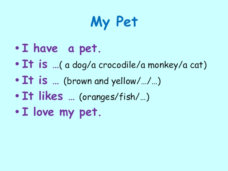 My PetI have a pet.It is …( a dog/a crocodile/a monkey/a cat)It is … (brown and yellow/…/…)