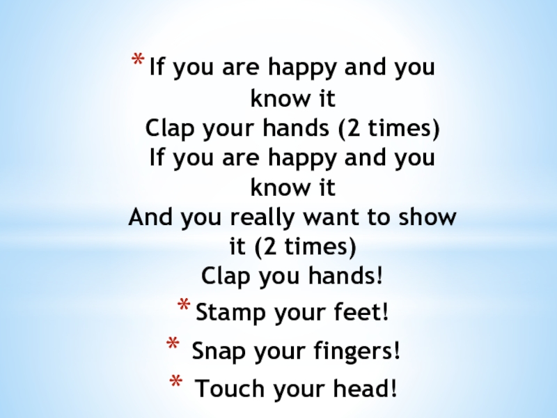(2 times) If you are happy and you know it And you really want to show it (2 times) Clap you hands!