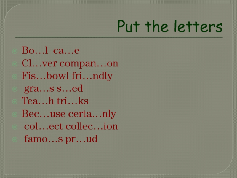 Put the lettersBo…l ca…eCl…ver compan…onFis…bowl fri…ndly gra…s s…ed Tea…h tri…ksBec…use certa…nly col…ect collec…ion famo…s pr…ud