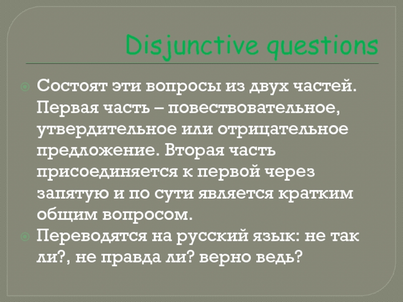 Disjunctive questionsСостоят эти вопросы из двух частей. Первая часть – повествовательное, утвердительное или отрицательное предложение. Вторая часть