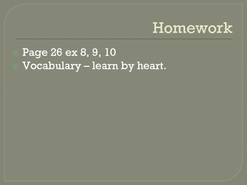 HomeworkPage 26 ex 8, 9, 10Vocabulary – learn by heart.