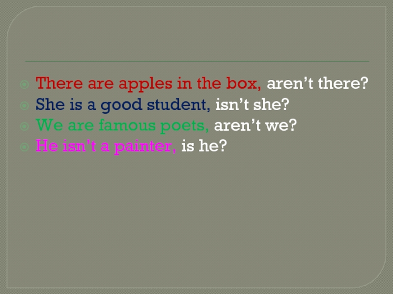There are apples in the box, aren’t there?She is a good student, isn’t she?We are famous poets,