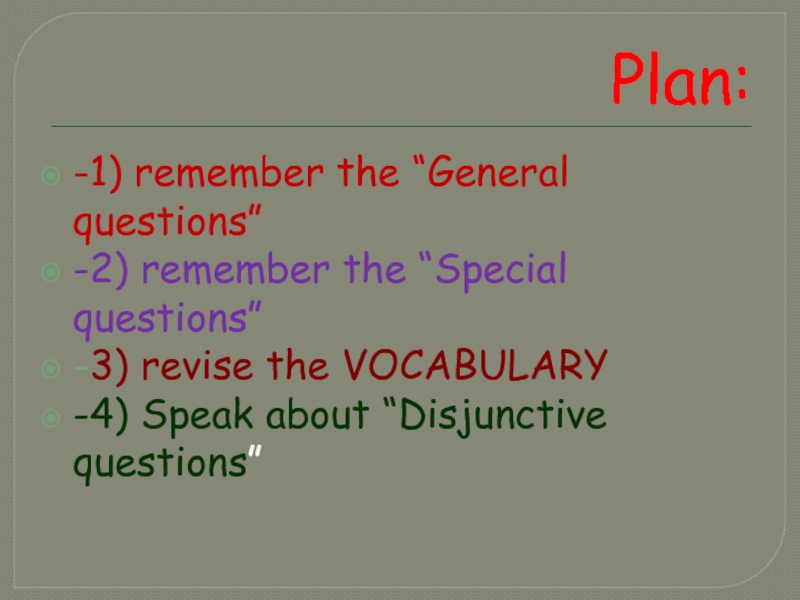 Plan:-1) remember the “General questions”-2) remember the “Special questions”-3) revise the VOCABULARY-4) Speak about “Disjunctive questions”