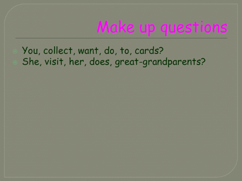Make up questionsYou, collect, want, do, to, cards?She, visit, her, does, great-grandparents?
