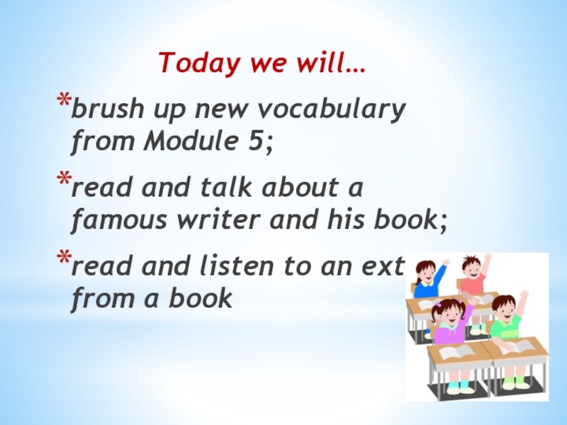Today we will…brush up new vocabulary from Module 5;read and talk about a famous writer and his book;read and listen to an extract from a book