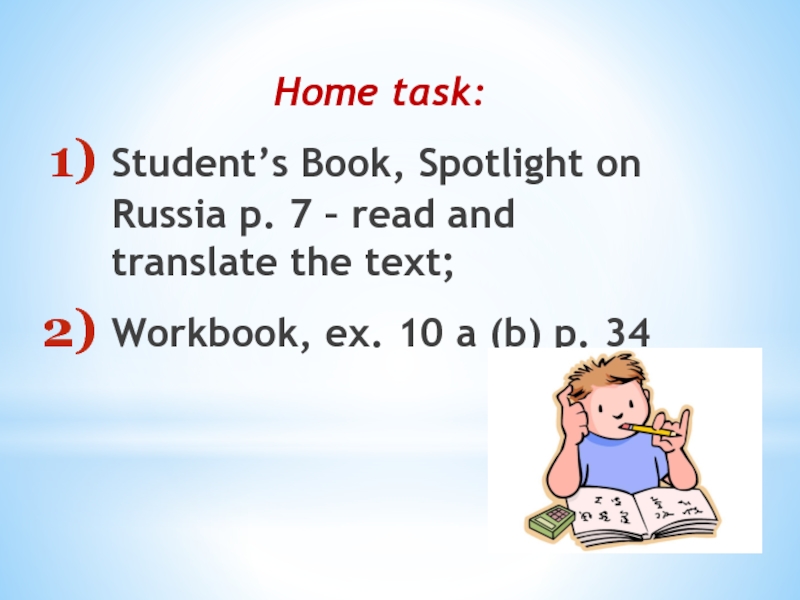 Home task:Student’s Book, Spotlight on Russia p. 7 – read and translate the text;Workbook, ex. 10 a