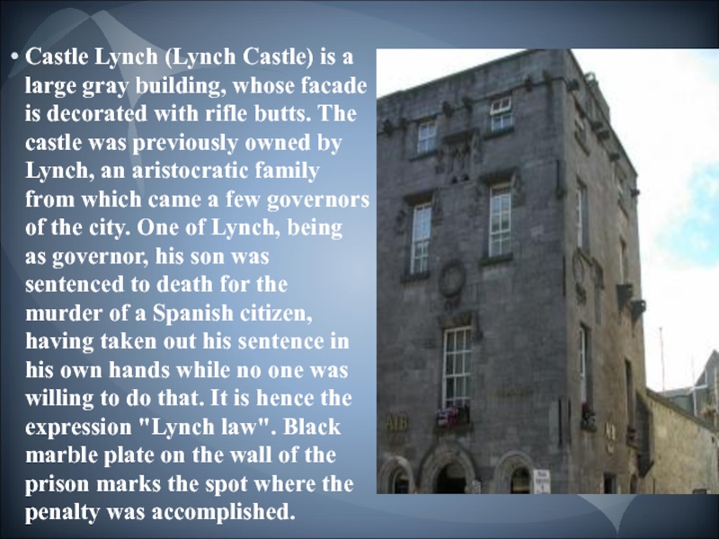 is decorated with rifle butts. The castle was previously owned by Lynch, an aristocratic family from which came a few governors of the city. One of Lynch, being as governor, his son was sentenced to death for the murder of a Spanish citizen, having taken out his sentence in his own hands while no one was willing to do that. It is hence the expression "Lynch law". Black marble plate on the wall of the prison marks the spot where the penalty was accomplished.