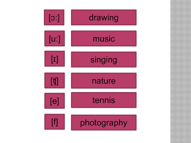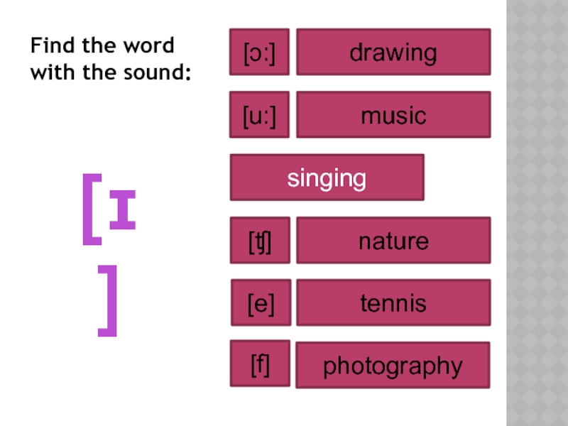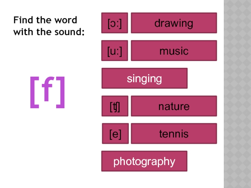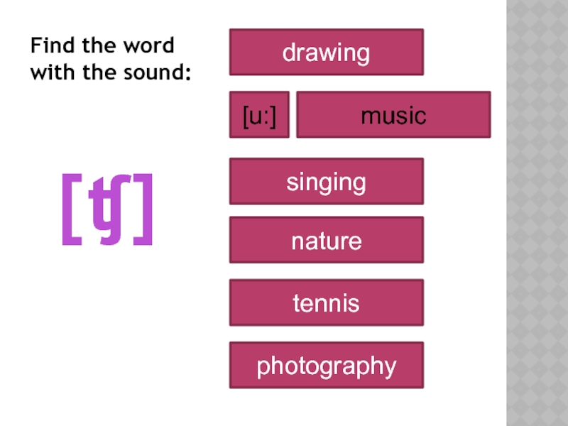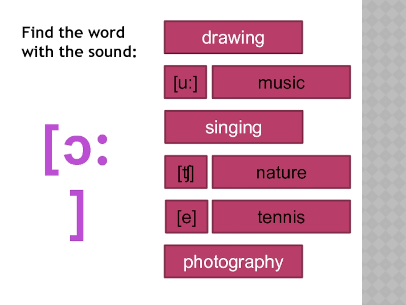 [f]drawingmusicnaturesingingtennisphotography[u:][ʧ][e][ɔ:]Find the word with the sound: