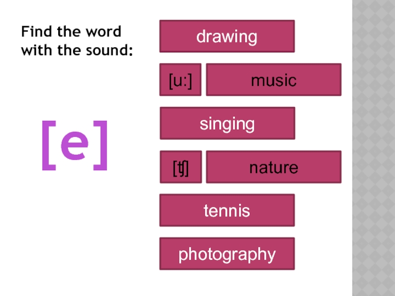 [e]drawingmusicnaturesingingtennisphotography[u:][ʧ]Find the word with the sound: