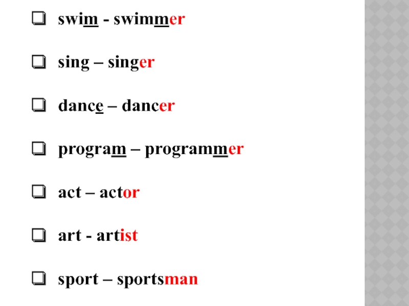 swim - swimmer				sing – singer					dance – dancer				program – programmer			act – actor					art - artist		sport – sportsman