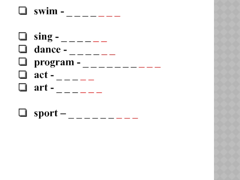 swim - _ _ _ _ _ _ _				sing - _ _ _ _ _ _					dance -