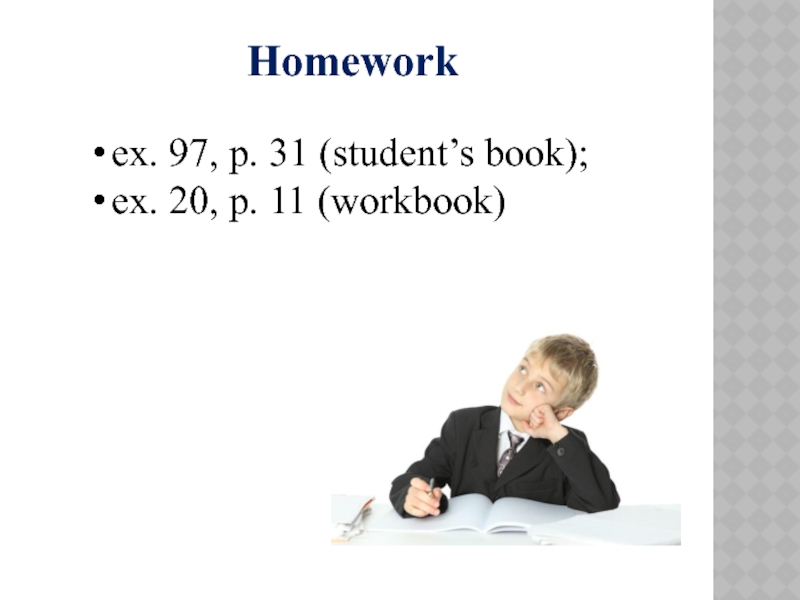 Homeworkex. 97, p. 31 (student’s book);ex. 20, p. 11 (workbook)