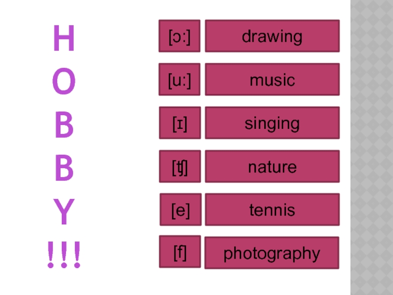 HOBBY!!!drawingmusicnaturesingingtennisphotography[u:][ʧ][e][ɔ:][f][ɪ]