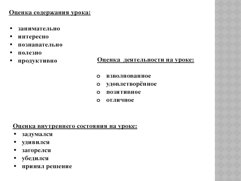 Оценка содержания урока:занимательноинтереснопознавательнополезнопродуктивноОценка деятельности на уроке:взволнованноеудовлетворённоепозитивноеотличноеОценка внутреннего состояния на уроке:задумалсяудивилсязагорелсяубедилсяпринял решение