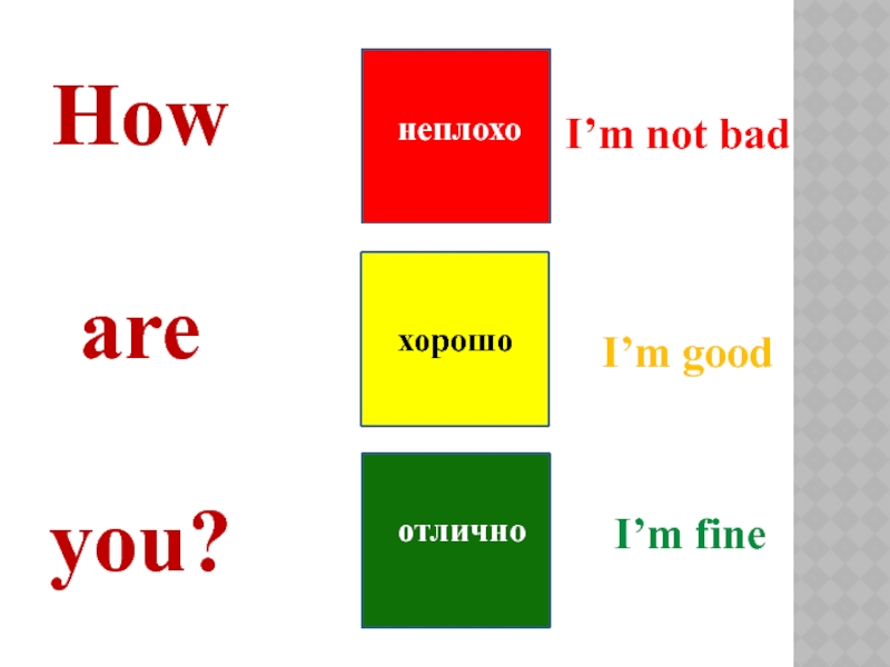 How are you?отличноI’m fineхорошоI’m goodнеплохоI’m not bad