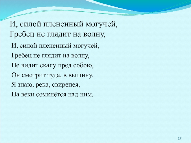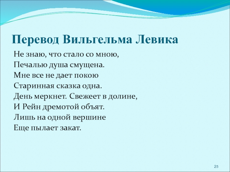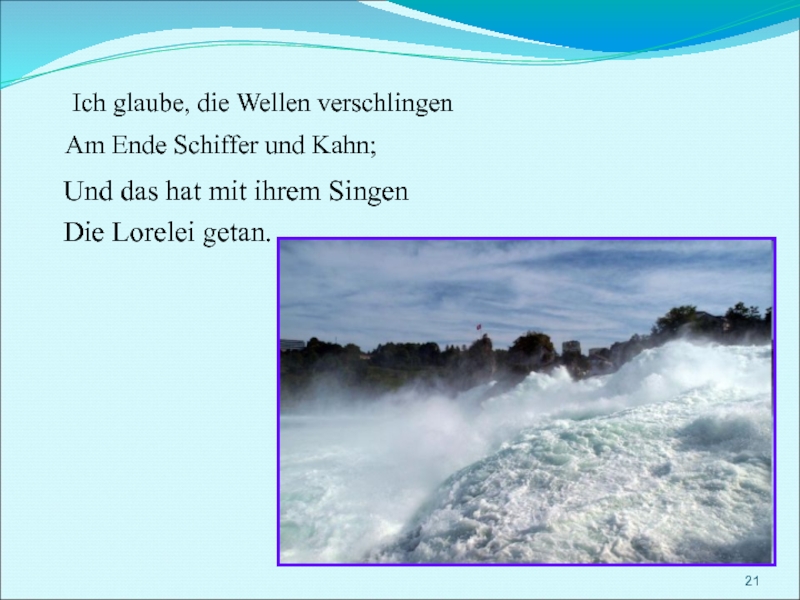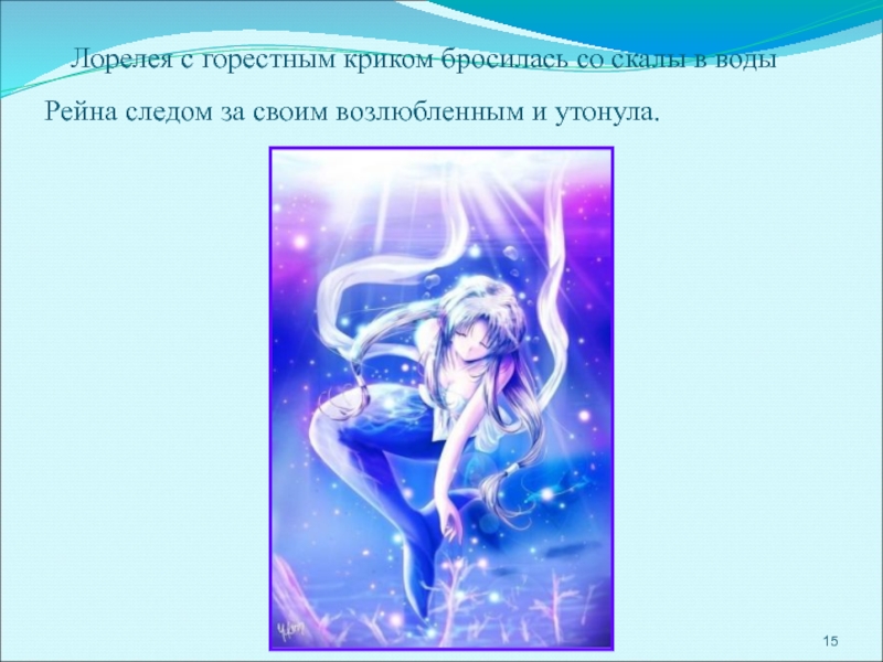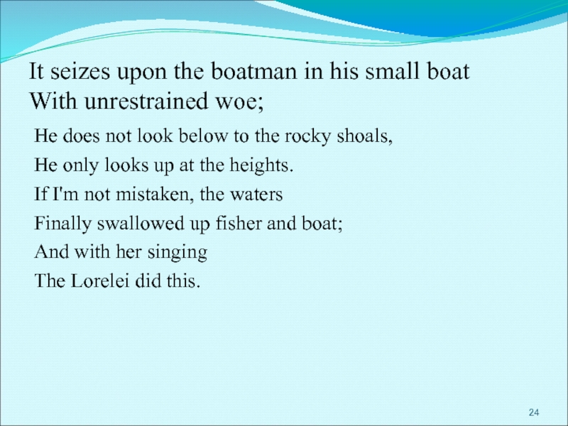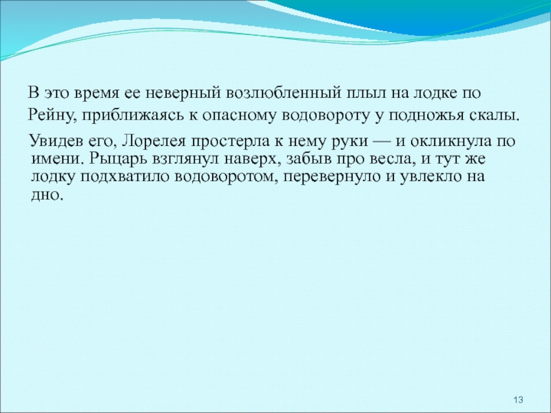 Увидев его, Лорелея простерла к нему руки — и окликнула по имени. Рыцарь взглянул наверх, забыв про весла, и тут же лодку подхватило водоворотом, перевернуло и увлекло на дно.