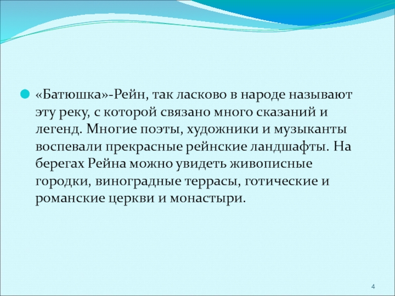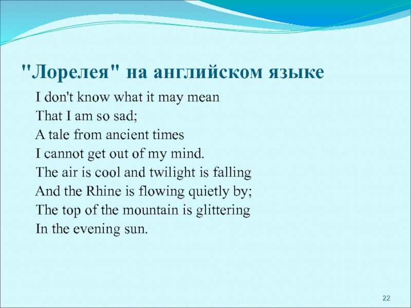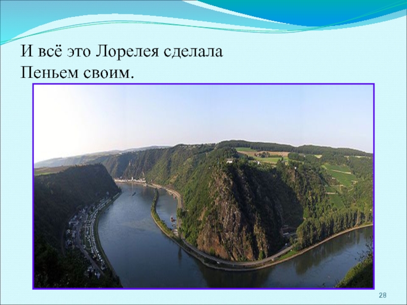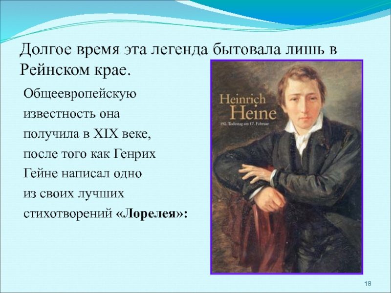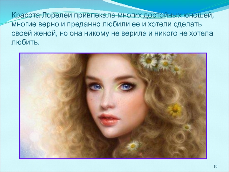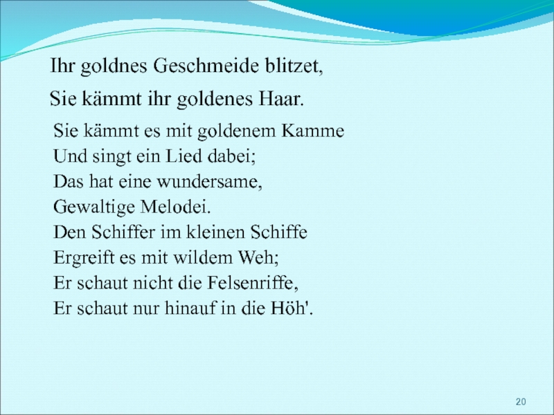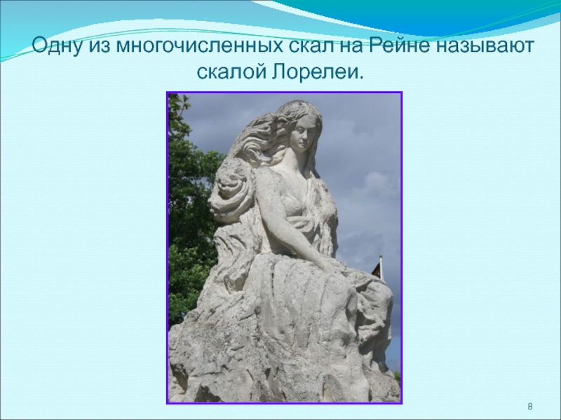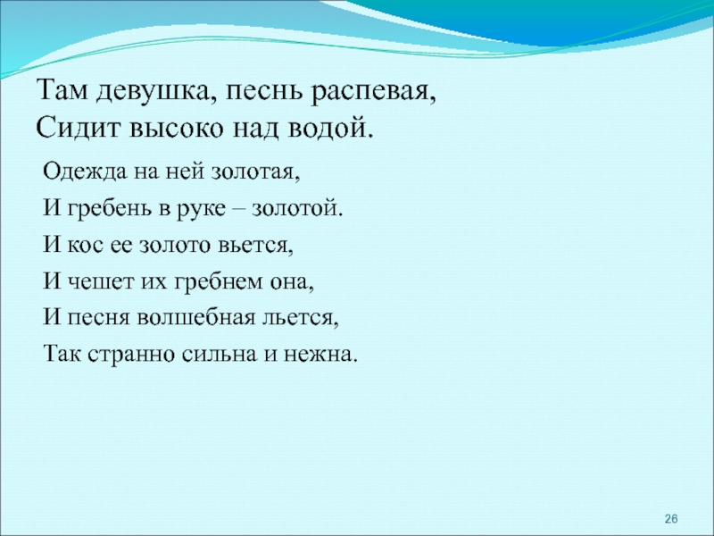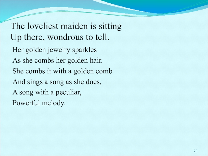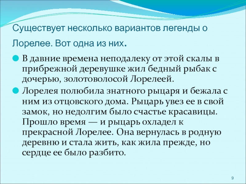 Словно живая, сидит Лорелея на вершине скалы, золотым гребнем расчесывает свои золотые волосы и поет так печально и нежно, что всякий, плывущий в этот час по Рейну, заслушавшись, забывает обо всем на свете и гибнет в водовороте у подножия скалы Лорелеи.