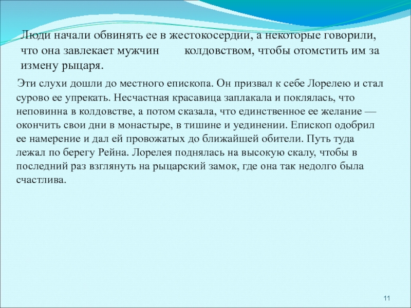 Эти слухи дошли до местного епископа. Он призвал к себе Лорелею и стал сурово ее упрекать. Несчастная красавица заплакала и поклялась, что неповинна в колдовстве, а потом сказала, что единственное ее желание — окончить свои дни в монастыре, в тишине и уединении. Епископ одобрил ее намерение и дал ей провожатых до ближайшей обители. Путь туда лежал по берегу Рейна. Лорелея поднялась на высокую скалу, чтобы в последний раз взглянуть на рыцарский замок, где она так недолго была счастлива.