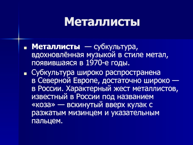 Металлисты — субкультура, вдохновлённая музыкой в стиле метал, появившаяся в 1970-е годы.