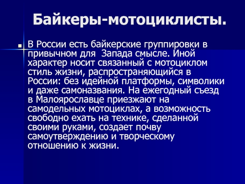 характер носит связанный с мотоциклом стиль жизни, распространяющийся в России: без идейной платформы, символики и даже самоназвания. На ежегодный съезд в Малоярославце приезжают на самодельных мотоциклах, а возможность свободно ехать на технике, сделанной своими руками, создает почву самоутверждению и творческому отношению к жизни.