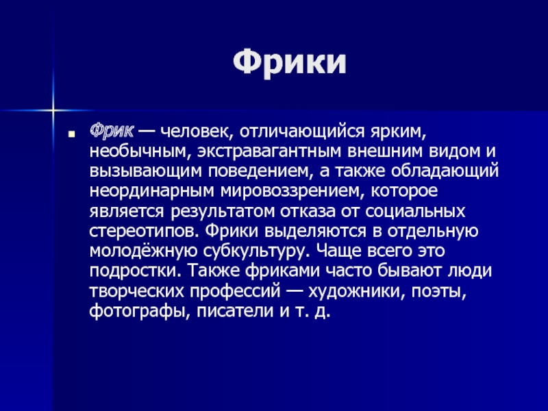 Фрик — человек, отличающийся ярким, необычным, экстравагантным внешним видом и вызывающим поведением,