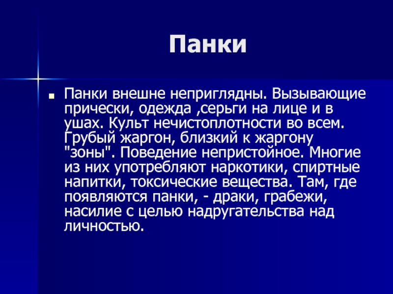 ушах. Культ нечистоплотности во всем. Грубый жаргон, близкий к жаргону "зоны". Поведение непристойное. Многие из них употребляют наркотики, спиртные напитки, токсические вещества. Там, где появляются панки, - драки, грабежи, насилие с целью надругательства над личностью.