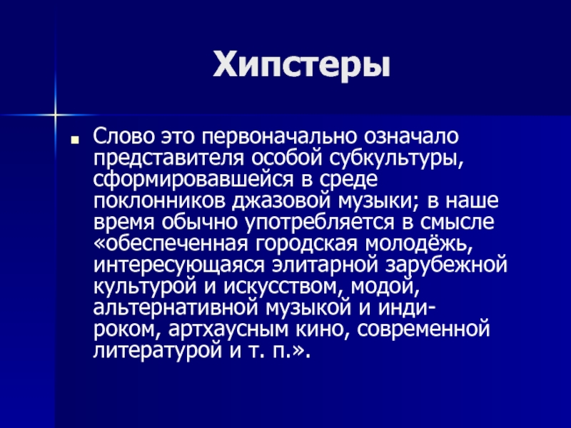 Слово это первоначально означало представителя особой субкультуры, сформировавшейся в среде поклонников джазовой музыки; в